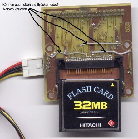 Ein CompactFlash läßt sich am PC wie eine Festplatte benutzen wenn man einen entsprechenden Adapter baut. Es verhält sich dann wie ein ATAPI Gerät und kann im BIOS einfach mit Einstellung AUTO als Festplatte angemeldet werden. Das Problem ist einmal den CompactFlash Stecker zu bekommen und zweitens ihn dann von Hand anzulöten (Pinabstand 0,63mm ! ). Den Stecker (von JST) habe ich bei Werner Wirth in Hamburg bekommen. Allerdings mit Firmenanfrage und einer größeren Bestellung. Einzelstücke liefern die glaub ich nicht. Elektor hat witzigerweise gerade selbst so einen Adapter in der April-Ausgabe 2002. Ich hab den da nicht abgekupfert ! Meiner lief schon ein halbes Jahr vorher. Die Applikation dazu habe ich bei SanDisk gefunden. Es wird wohl einfacher/billiger sein sich bei Elektor einen fertigen Adapter zu kaufen als ihn selbst zu bauen. CF-Sockel habe ich inzwischen bei RS Components für ca. 8 Euro gesehen. Farnell soll auch welche haben. Alternative Beschaffung: Kauf dir einen billigen USB 6 in 1 Reader und versuch den CF-Sockel mit einer Heißluftpistole auszulöten. Da sind dann auch gleich Sockel für MMC, SD und SmartMedia Cards mit drauf. Alle zusammen für weniger Geld als ein einzelner CF-Sockel vom Distributor. Nachteile: CompactFlash kann man nicht beliebig oft beschreiben ! So zwischen 10000 und 100000 mal pro Sektor ist heutzutage möglich. Man sollte also nicht unbedingt Windows darauf laufen lassen. Für kleine DOS-Systeme oder Linux-Router, die ihre Daten in der RAM-Disk ablegen und nicht zu oft auf die Festplatte schreiben, ist ein CompactFlash aber wunderbar geeignet. Ich betreibe damit einen kleinen FLI4L-Linux-Router mit einem ISA-Slotkarten PC. Dabei konnte ich den CompactFlash nicht als Slave parallel zu einer Notebookplatte unter Linux betreiben. FLI4L wollte dann nicht einmal von der Festplatte booten ! Unter DOS war das kein Problem. Als Master alleine geht es aber. Mit diesem Adapter kann man die CompactFlash-Karte nicht bei laufendem PC wechseln ! Es gab eine Menge Fragen ob es nicht auch umgekehrt geht. Also IDE Festplatte an CompactFlash Anschluß von einem PDA, Handheld PC oder sogar der Digitalkamera (auf was für schwachsinnige Ideen manche Zeitgenossen kommen). Wieso denken eigentlich alle, das wenn man einen CF an IDE anschließen kann, das es zwangsläufig auch umgekehrt gehen muß ? CF in Digicams werden wohl eher im Memory-Mapped Modus als im True-IDE Modus betrieben. Wieso sollte ein Hersteller eine komplette IDE-Schnittstelle einbauen wenn es auch BILLIGER geht ? Komischerweise verkauft auch niemand entsprechende Adapter. Ist doch irgendwie merkwürdig oder nicht ? Weitere Anfragen zu diesem Thema landen in meinem Mülleimer.